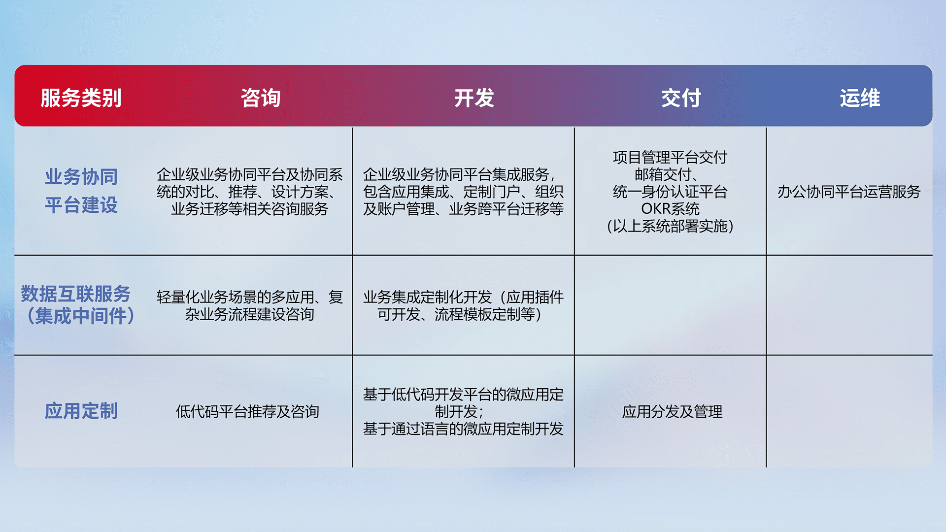 针对钉钉、、、、企微、、IDaas等平台级产品提供产品的规划、、、方案、、、、交付、、、定制化开发等服务,,,实现如统一协同办公、、、、智能客户服务、、、、混合会议管理、、智能数据查询、、、、等业务场景,,,实现数字化转型。。。