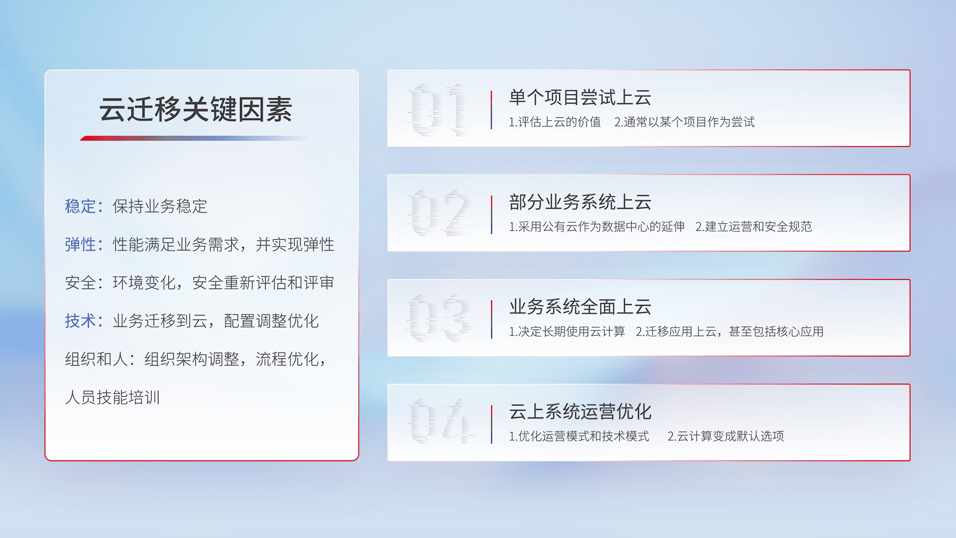 结合实际业务,,,,从规划设计、、云平台选型、、、、云原生改造、、、、数据迁移、、、、集成交付,,,,迁移全过程为客户识别最佳上云路径,,做好风险识别管理,,,,设计网络架构、、、身份权限、、、安全审计合规、、、操作审计、、、日志审计、、、监控告警策略、、多站点容灾设计等,,,,对云上基础设施进行整体规划,,,,提升IT治理水平,,以满足弹性、、、、高可用、、、高性能的需求。。。。
